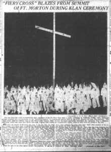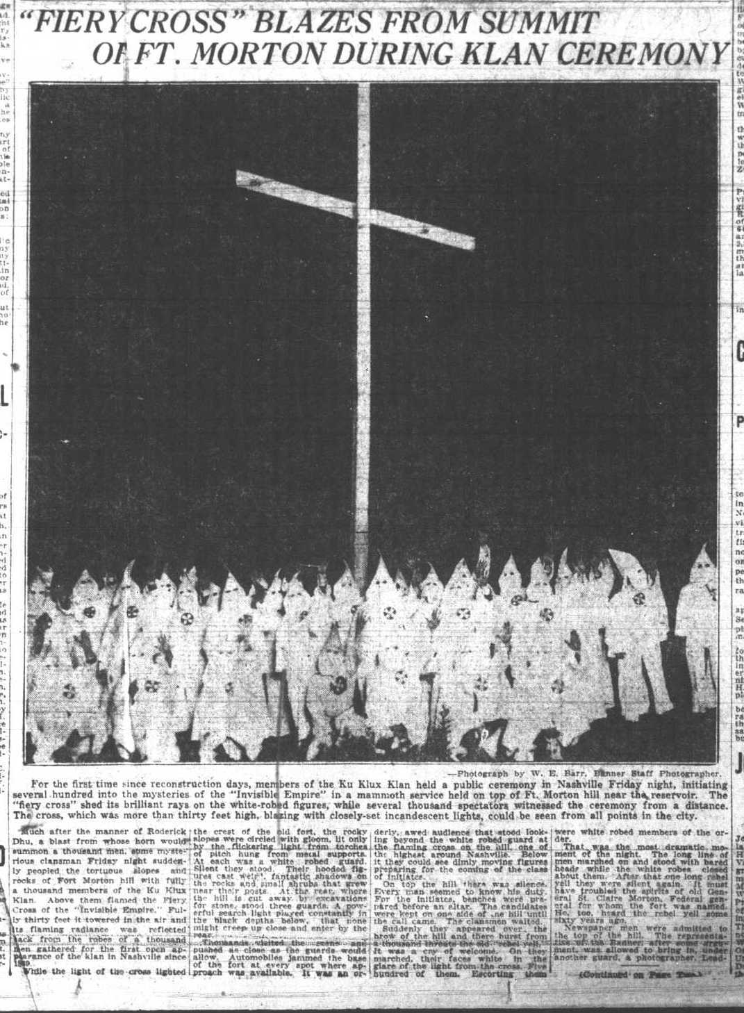 IF YOU THINK YOUR STUDENTS ARE MATURE ENOUGH TO DEAL WITH THIS, click on the right to see a front-page story and photo that appeared in the Nashville Banner on June 2, 1923. Photos didn’t accompany local news stories very much in the 1920s, but obviously it did on this occasion. The hill where this KKK meeting occurred now has Carter Lawrence Elementary School and the Belmont University baseball stadium on it.