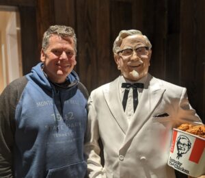 I recommend a trip to the Sanders Cafe and Museum in Corbin, Kentucky. (While there, go see Cumberland Falls — the waterfall so awesome that it forces the Cumberland River downstream to Nashville!) As you can see on the left, I visited Corbin and said hi to the Colonel.